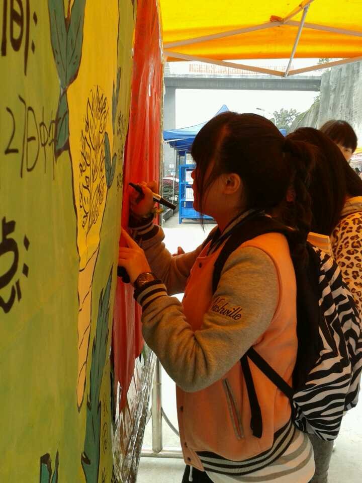 今年的“地球一小时”活动以“告别雾霾,蓝天自造”为主题。通过签字活动、微博、倡议书等形式邀请同学们承诺在3月29日晚上8:30-9:30熄灯一小时。在工作人员的悉心讲解下,同学们认真了解,积极参与,纷纷签下自己的名字,用行动表达对“地球一小时”活动的响应,并积极佩戴绿丝带,加入环保志愿者的队伍。