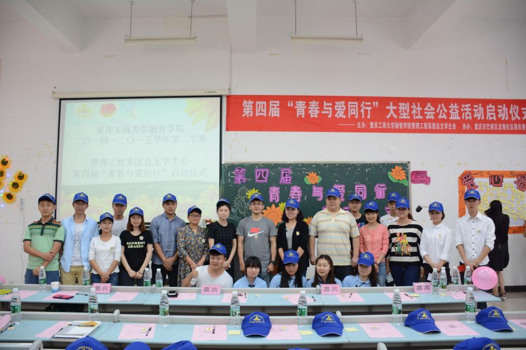 (通讯员 刘光念 李群)2015年5月7日中午,管理工程系第四届“青春与爱同行”大型公益活动在10503教室正式启动。重庆悟拓帮投资管理有限公司总经理王鹏飞、项目经理代绍娟和李陈松、管理工程系党总支副书记罗婷婷、学团办主任王玲艳、团委副书记李刚、专职辅导员练丹及梁珍铭老师应邀出席,与106位志愿者共同见证本届“青爱”的启动。